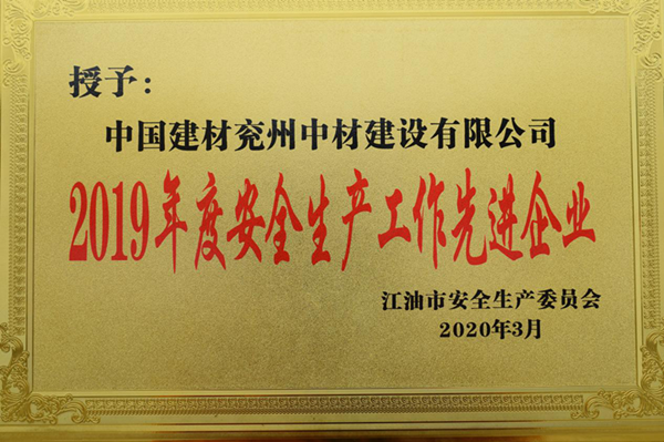 兗州中材建設(shè)有限公司江油分公司榮獲江油市“2019年度安全生產(chǎn)工作先進(jìn)企業(yè)”稱號(hào)