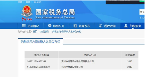 近日,稅務(wù)機(jī)關(guān)組織實施的2017年度納稅信用等級評定結(jié)果“出爐”,兗州中材建設(shè)有限公司繼2015、2016年度榮獲A級納稅信用企業(yè)后,再次榮獲A級納稅信用企業(yè)。