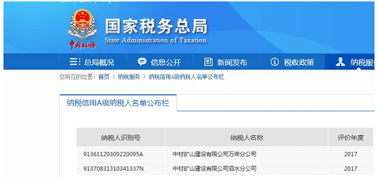 中材礦山萬年分公司榮獲2017年度“A級納稅信用企業”
