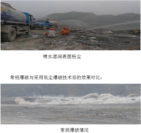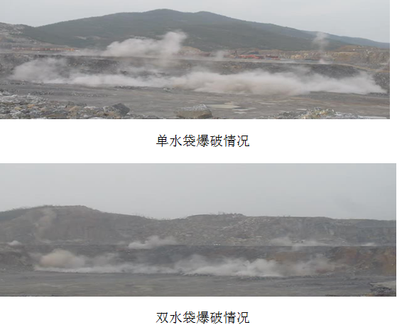 (5)、采用低塵爆破技術(shù)對于礦山爆破進行降塵作業(yè): 爆破粉塵的來源:一是爆破物體表面的粉塵,鉆孔產(chǎn)生的巖粉;二是爆破物體破碎產(chǎn)生的粉塵,爆破物體坍塌產(chǎn)生的粉塵,爆炸沖擊波和爆炸氣體揚起的粉塵。 爆破粉塵的危害:一是環(huán)境危害,主要包括大氣污染和生態(tài)系統(tǒng)的破壞,粉塵污染后的空氣通過大氣循環(huán)對周邊的城市空氣質(zhì)量造成嚴重影響;二是社會危害,對人體健康危害,引起塵肺病等。 目前,關(guān)于爆破降塵有多種不同的工藝,其中利用水袋進行低塵爆破技術(shù)的降塵是一種相對方便 水袋法降塵爆破主要依據(jù)炸藥爆炸使水袋中的水形成水霧霧滴,水霧霧滴都是有一定大小,水霧水滴對爆破粉塵進行捕捉而濕潤塵粒,達到降塵效果。 根據(jù)水霧霧滴與粉塵作用原理,水霧霧滴對粉塵的作用時間越長越好,因此應設(shè)定水袋受爆炸沖擊波影響一定的時間間隔,使水霧霧滴與粉塵具有較長的作用時間。為加強除塵效果,單個炮孔的周圍不會只設(shè)置1個水袋,因此還要確定不同布置位置水袋起爆時間。 以上單水袋、雙水袋的設(shè)置位置是在裝藥完成之后,在堵塞段中考慮設(shè)置的水袋位置。底部水袋:是指自裝藥完成后,在堵塞段的底部安放的水袋,其水袋與炸藥緊密接觸,水袋安放注水后再行填塞;頂部水袋:是指在填塞的最后時,預留一定的空間安放水袋;水袋注水后都是填塞的一部分,與填塞形成一個整體。 對于鉆孔巖粉經(jīng)設(shè)備收塵后,都是堆積在炮孔口附近,與爆破物體表面粉塵在經(jīng)歷爆破震動及爆破沖擊波的沖擊后,粉塵都將揚起,在起爆前需要用水將鉆孔巖粉及爆破物體表面粉塵進行濕潤處理,使其在爆破時的爆破震動及爆破沖擊波不能形成揚塵。
