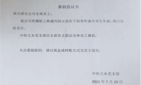 呂梁分公司某員工的父親因車禍住進ICU搶救多日,每天開銷巨大。中陽文水黨支部經過全體會議通過發起愛心捐款活動。