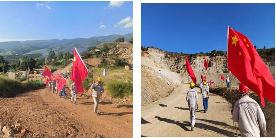 唱完國歌,員工們在項目經理及各黨員的帶領下,每人領取了一面國旗和旗桿,興致勃勃的向礦區走去。